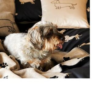 Pleddet kommer i 2 farger, hvit/ beige og sort/brun. Se forøvrig ogå våre andre produkter i serien We love dogs. Vi har fått inn både sengesett, putetrekk og håndklær med vakkert hundemotiv